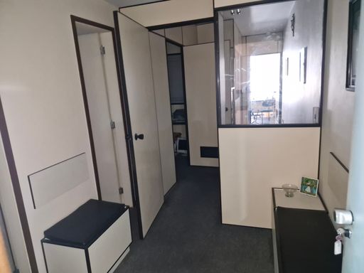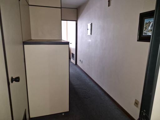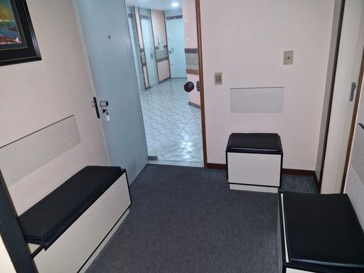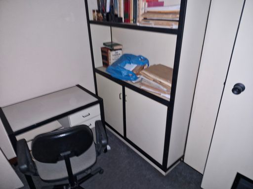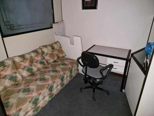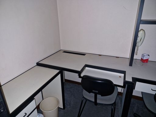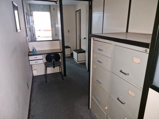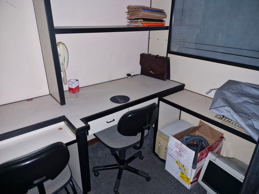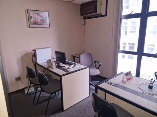 Sala mobilhada com divisórias, toda montada com copa e banheiro.